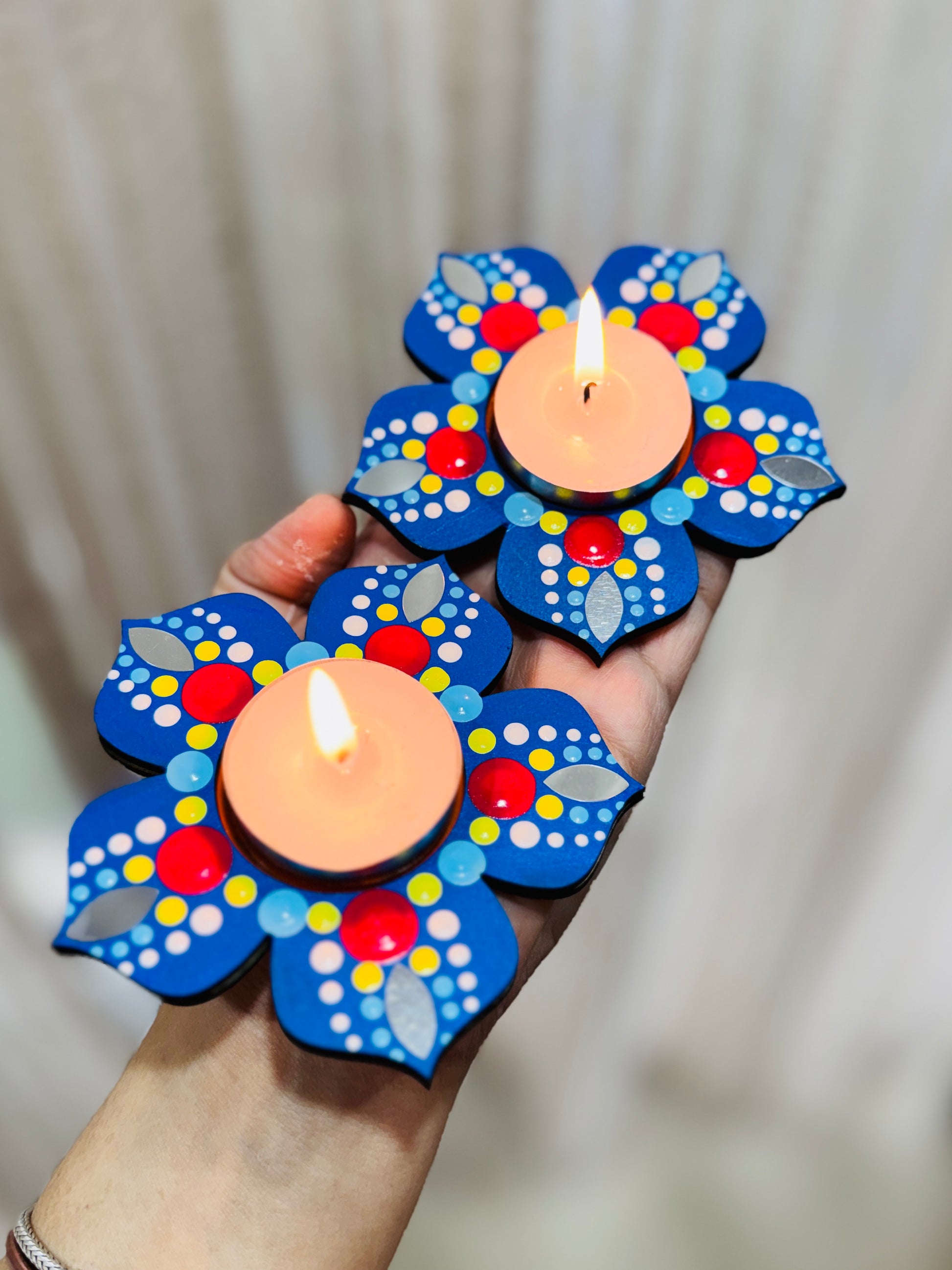 Add a splash of vibrant colour and handmade charm to your home! This set includes one pair (two total) of 4-inch, wooden flower-shaped tea light holders, each featuring a unique, multi-colour hand-painted design. Perfect for festive decor, tabletops, or as a thoughtful gift.